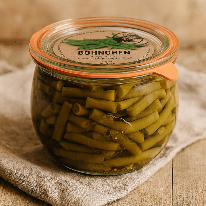 Grüne Böhnchen süß-sauer eingelegt in Essig – gut geeignet als Salat.